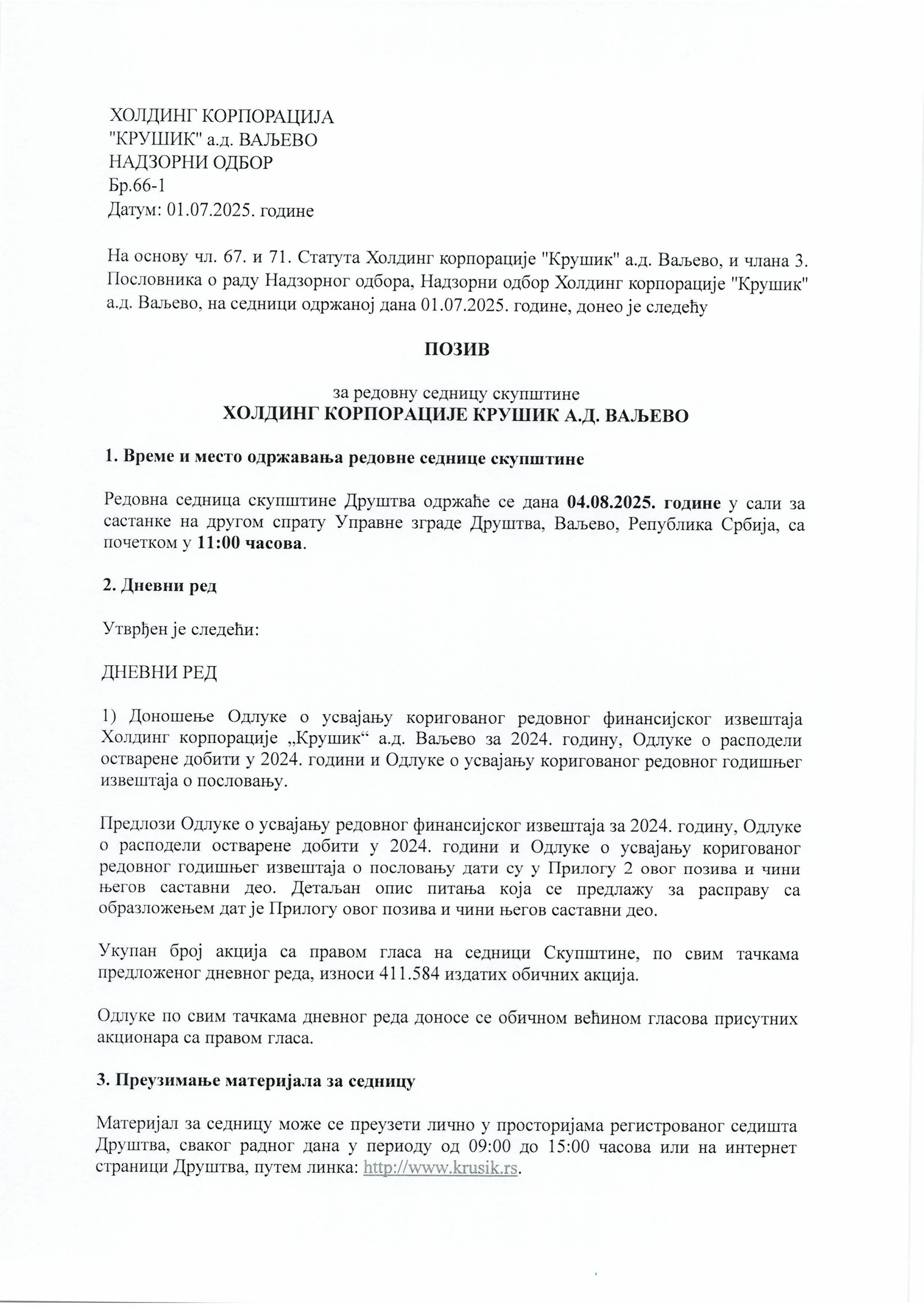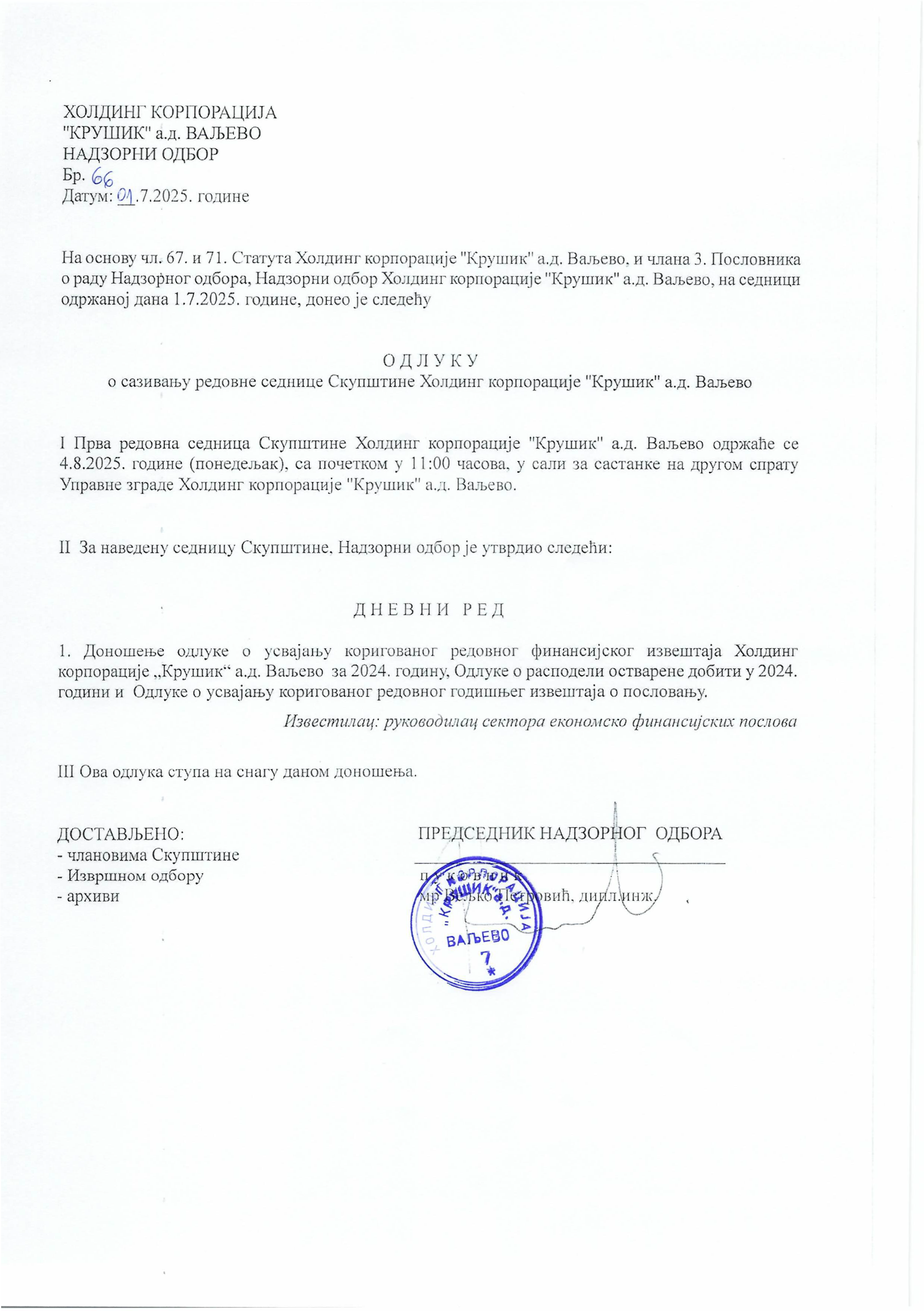 Одлука о сазивању редовне седнице Скупштине Холдинг корпорације "Крушик" а.д. Ваљево
